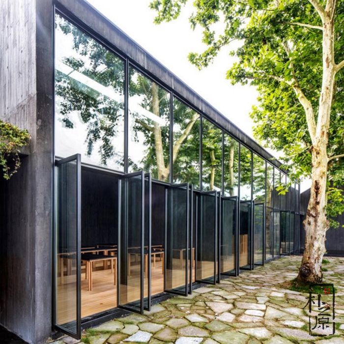 独立茶室内两侧的玻璃门,都是可以完全打开的。