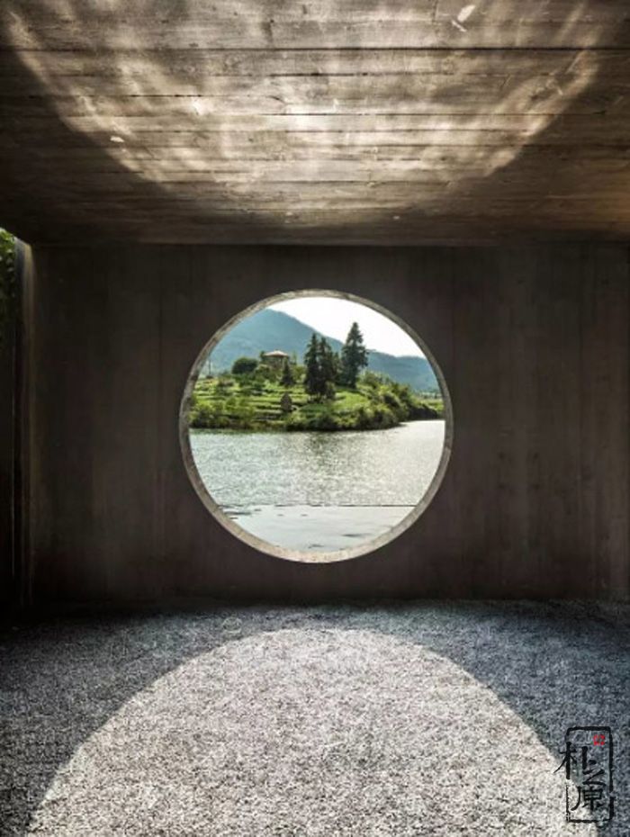南端尽头的冥想空间面向西侧湖面,圆形开口是向外观景的景窗。这个空间更是一个借入自然的转换器:下午,太阳及其在水里的反射,通过圆洞会形成两个随夕阳西下而慢慢交汇的投影光圈。